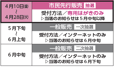 これまで実施していた一般販売後の「インターネット販売(先着)」は行いません。残席が出た場合は「一般販売(二次抽選)」を実施。全ての販売方法が“抽選”となります。