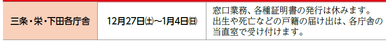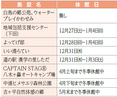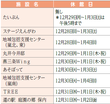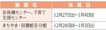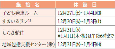 *上記以外の各施設の休みは、12月29日(月)~1月3日(土)です。