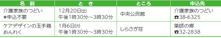 家族などを介護している人が、介護の知識や技術を学び、介護者同士で悩みや困り事を話し合います。