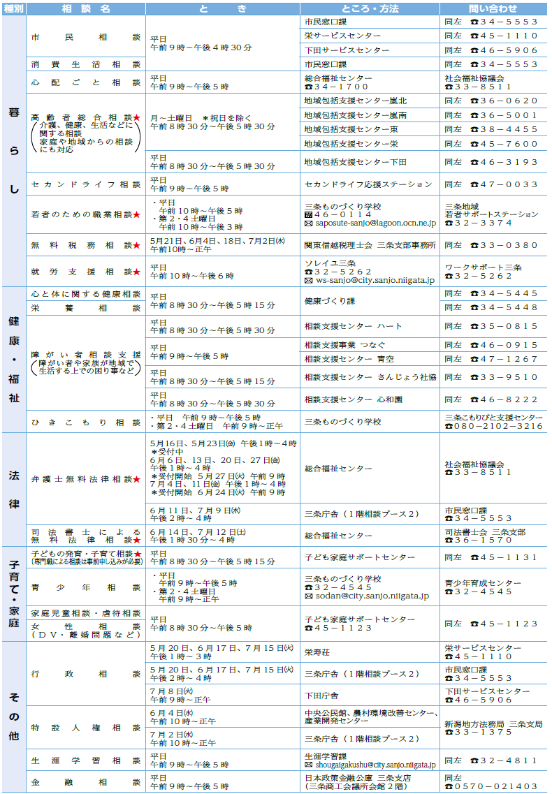 くらし 5月16日~7月15日の各種相談日 33/35 前の記事 次の記事 発行日 : 2025年05月01日 自治体名 : 新潟県三条市 広報紙名 : 広報さんじょう 令和7年5月1日号 *平日とは月~金曜日で、祝日・年末年始は除きます。 ★マークは事前申し込みが必要です。 Tweet シェアする 市民総合窓口での手続きは予約いただくとスムーズです 子育て情報 PICKUP