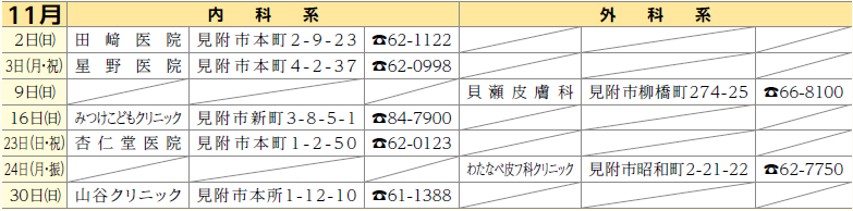 ■見附地域の休日在宅当番医(市外局番【電話】0258)