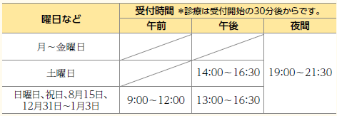 診療時間:午前9時~11時30分、午後1時~4時30分