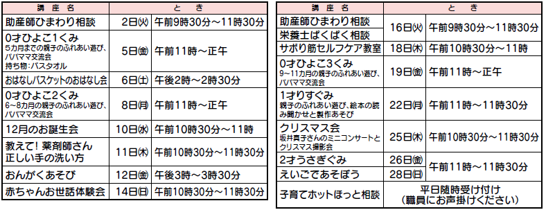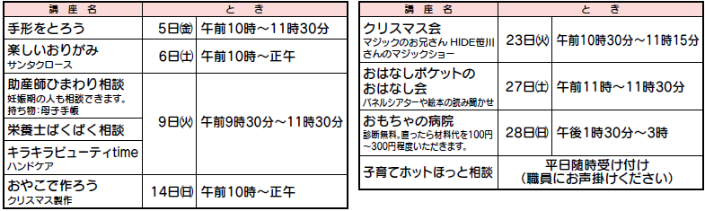 12月の休館日:9日(火)、23日(火)、30日(火)、31日(水)