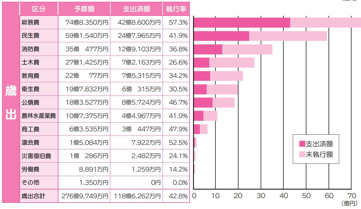 歳出予算は、全体で118億6,262万円が支出され、予算に対する執行率は42.8%となっています。