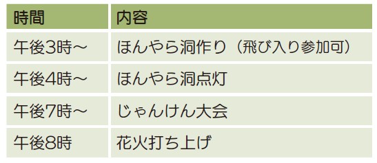 ・ほんやら洞作りに参加する方はスコップを持参してください。