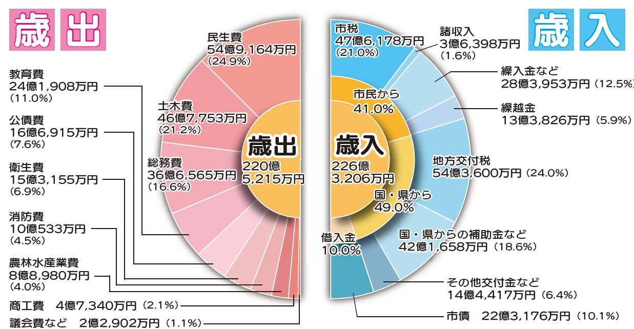 令和6年度一般会計の歳入総額は226億3206万円、歳出総額は220億5215万円で、その差額5億7991万円を令和7年度に繰り越しました。このうち1億1631万円は令和6年度に完了しなかった工事などの繰り越しで、使いみちが決まっています。したがって、実際の黒字額は4億6360万円となります。