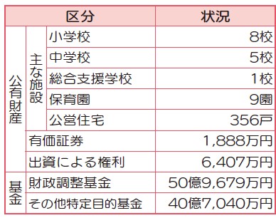 市の財産には学校などの土地、建物のほか、将来実施する事業のための積立金である基金や有価証券、出資金などがあります。主な財産の状況は下表のとおりです。