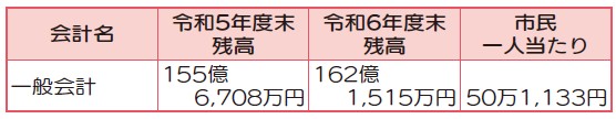市債は、事業を行うために必要なお金を借り入れるものです。一般会計の令和6年度末の残高は前年度に比べ6億4807万円増えました。