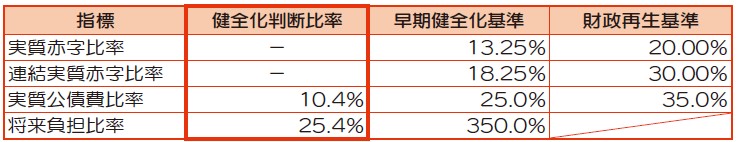・将来負担比率:一般会計などで将来負担する見込みの債務の比率で、将来財政を圧迫する可能性の度合いを示す指標
