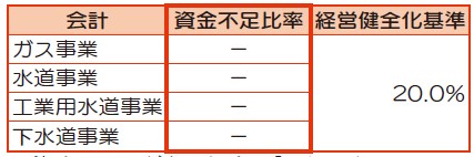 ・資金不足比率:企業会計ごとの事業の規模(料金収入規模)に対する資金不足額の比率で、経営状況の深刻度を示す指標
