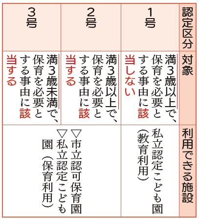 年齢や保育を必要とする事由に応じた認定の申請が必要です。認定区分によって利用できる施設が異なります。