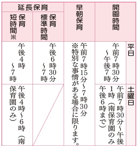 保育時間:認定区分や保護者の勤務時間などの状況に応じて、左表の開園時間の範囲で決定します。保育時間・延長保育の詳細は各園にお問い合わせください。