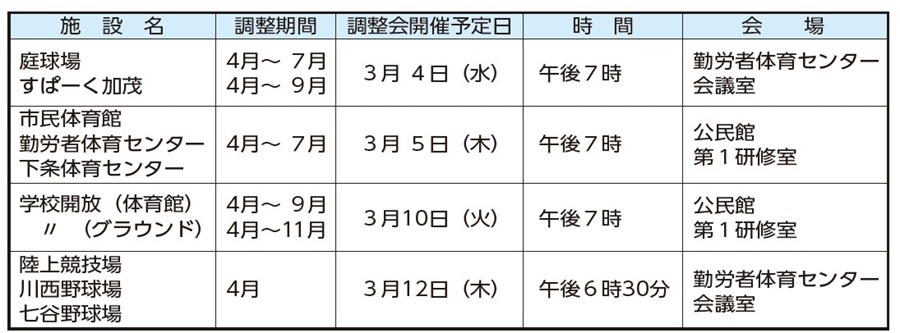 屋内・屋外体育施設や学校を定期的に利用する団体が、有効活用できるよう表のとおり調整会を開催します。利用を希望する団体は、2月17日(火)までに「定期利用団体登録申請書」と「会員名簿」を勤労者体育センター内スポーツ振興課(【電話】53-2206)または公民館(【電話】52-1953)に提出し、調整会に出席してください。なお、調整会を欠席された場合、希望日の利用ができなくなる場合があります。