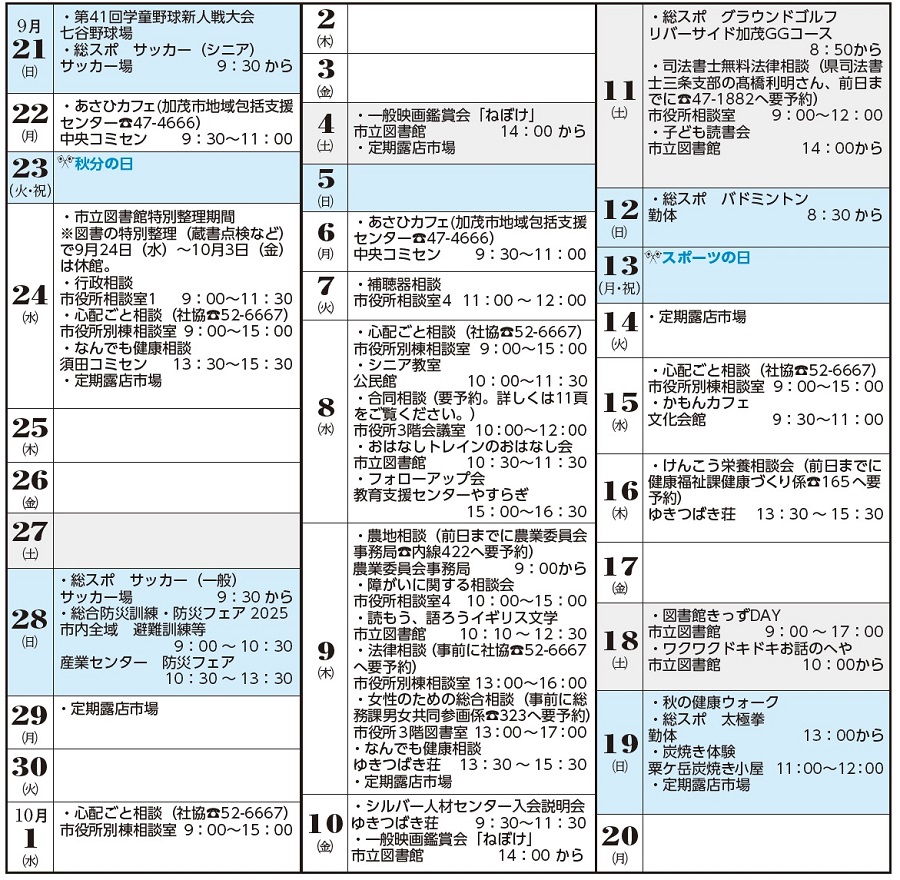 くらし 暮らしのカレンダー 9月・10月 35/40 前の記事 次の記事 発行日 : 2025年09月15日 自治体名 : 新潟県加茂市 広報紙名 : 広報かも 令和7年9月号 保健・衛生事業の日程は、健康カレンダーをご覧ください。 ■今月の納税 国民健康保険税・介護保険料…3 期、 後期高齢者医療保険料…6 期 納期限・口座振替日…9 月30 日(火) Tweet シェアする 行政手続きのデジタル化についてのアンケートへご協力をお願いします 休館日(9/21(日)~10/20(月))