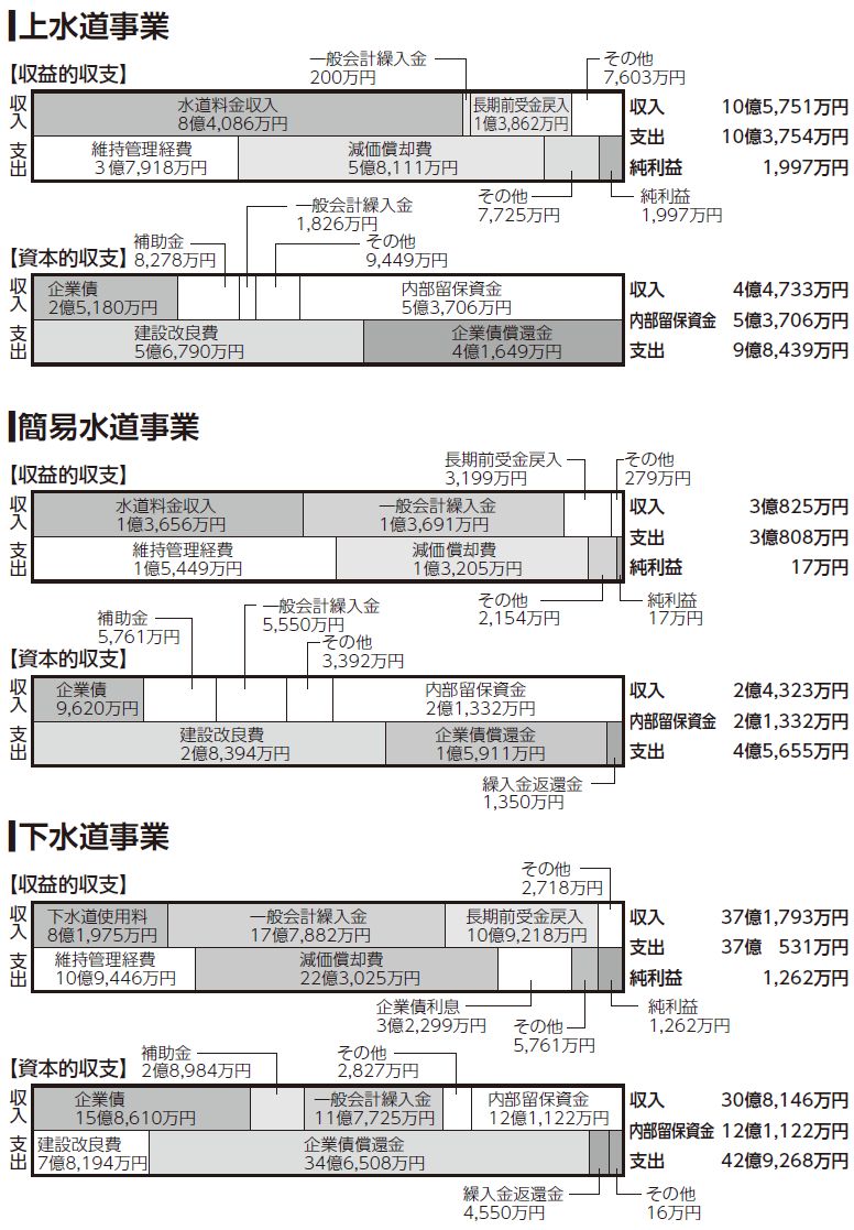 資本的収支は、収入が2億4,000万円、支出が4億5,000万円となり、内部留保資金で不足分の2億1,000万円を補填しています。資本的収支も、企業債の償還金などの財源として、一般会計から約5,500万円を繰り入れました。