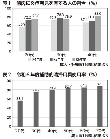 20代~40代は、歯肉に炎症所見を有する人の割合が増加傾向にあり、補助的清掃用具の使用率が低い状況です(表1・2)。