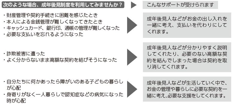 認知症や知的障がい、精神障がいなどにより、お金の使い方や書類の手続き、福祉サービスなどの契約を一人で考えて決めることに不安や心配のある人へ、本人の意思を尊重しながら、いろいろな契約や手続きをサポートする制度です。