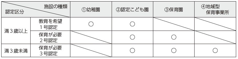 ・支給認定には子どもの年齢や保育の必要に応じて3つの区分があり、認定区分によって利用できる施設や時間が異なります(各施設の詳細は、次ページをご覧ください)。