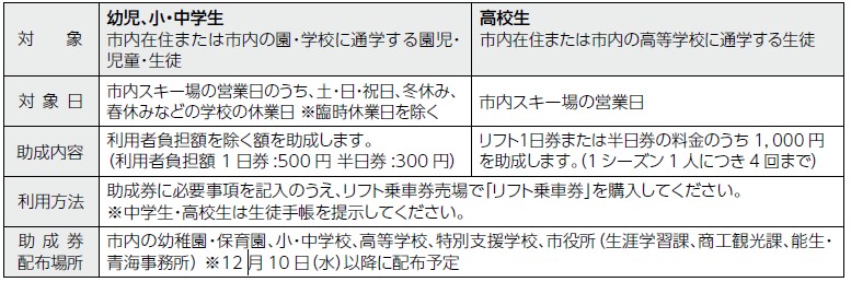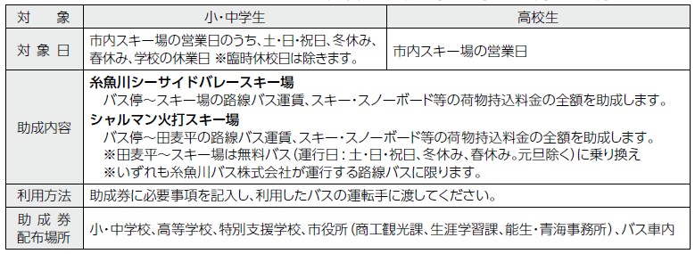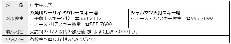 助成内容:糸魚川シーサイドバレースキー場、シャルマン火打スキー場が指定する対象品費の半額を補助(上限2,000円)