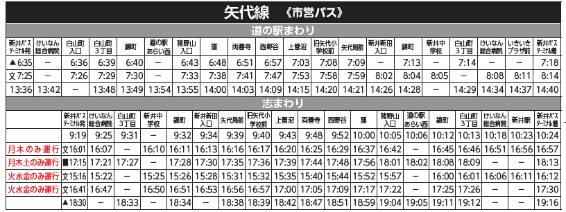 10月14日(火)から令和8年3月31日(火)まで、新井中学校の下半期の下校時刻に合わせる形で、「志まわり」の「月曜のみ運行文16:01」は月木のみ運行に、「月土のみ運行 17:15」は月木土のみ運行に変わります。それに伴い、火~金のみ運行の夕方の文印は、火水金のみ運行に変わります。その他の運行時刻に変更はありません。