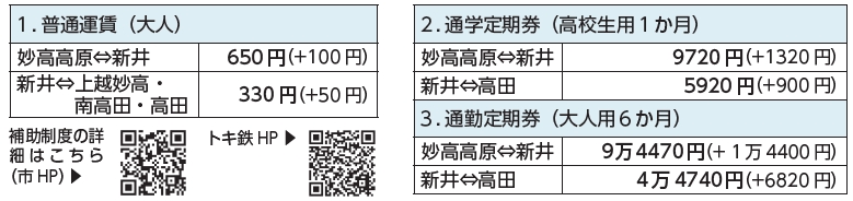えちごトキめき鉄道(株)はエネルギー価格高騰や人口減少による減収などにより、厳しい経営状況が続いていて、今後の安定した経営持続のために、10月1日から運賃改定(値上げ)を行うことを運輸局へ申請中(8月21日時点)です。改定の対応策として市は、10月1日以降に購入した「えちごトキめき鉄道(株)の通学定期券」に対する購入金額の一部を補助するメニューを追加(既存の補助制度を拡充)します。