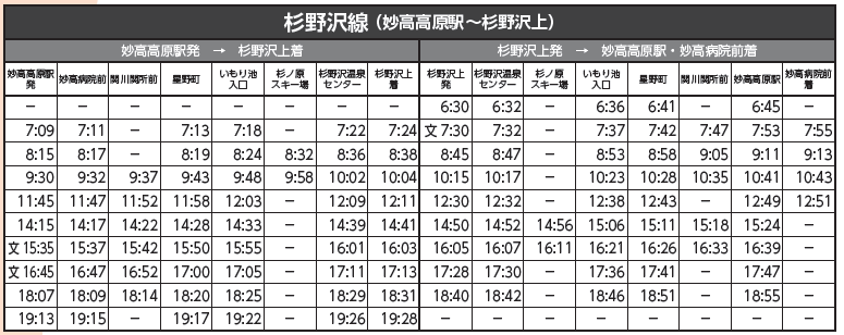 ・杉野沢線の「妙高高原駅8:15発」、「妙高高原駅9:30発」及び「杉野沢上14:50発」、「杉野沢上16:05発」のバスは、杉ノ原スキー場を経由する運行に変更となります