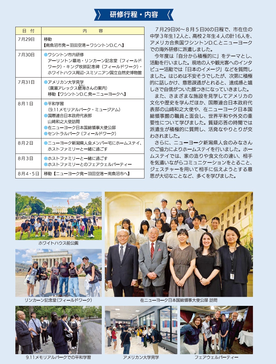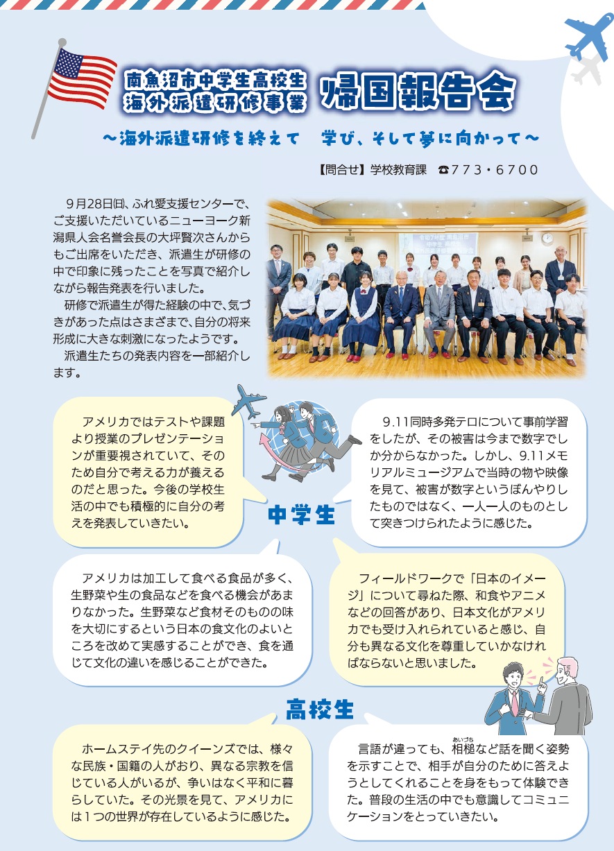 子育て 南魚沼市中学生高校生海外派遣研修事業 帰国報告会 1/29 次の記事 発行日 : 2025年12月01日 自治体名 : 新潟県南魚沼市 広報紙名 : 市報みなみ魚沼 令和7年12月号 Tweet シェアする AIオンデマンド交通の実証運行を開始します