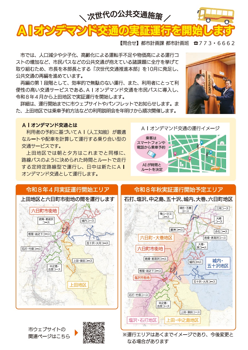くらし AIオンデマンド交通の実証運行を開始します 2/29 前の記事 次の記事 発行日 : 2025年12月01日 自治体名 : 新潟県南魚沼市 広報紙名 : 市報みなみ魚沼 令和7年12月号 Tweet シェアする 南魚沼市中学生高校生海外派遣研修事業 帰国報告会 降雪時期に備えましょう
