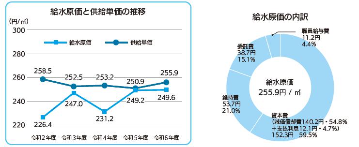 水道水1m³当たりの製造原価で、年間の水道水を供給するために要した薬剤費、動力費、施設の維持管理費などの費用を有収水量(供給水量)で割った値です。