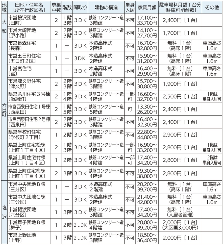 申込方法:入居資格を確認のうえ、本庁舎福祉課、大和・塩沢市民センターで申込書を配布。申込書に必要書類を添付し、募集期間内に福祉課公営住宅係へ提出。
