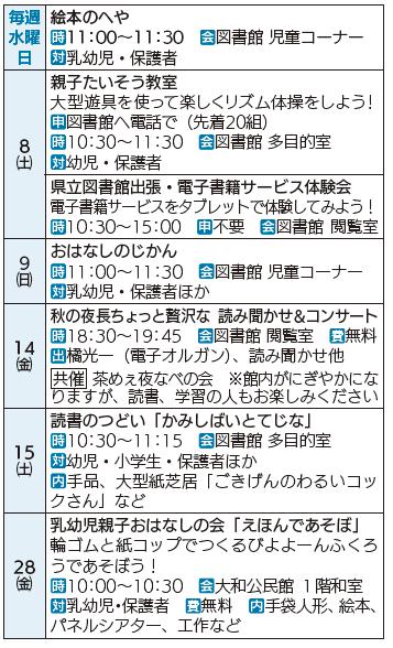 「糖尿病予防」「アルコール関連問題啓発週間」「秋旅」「絵本の日」「交流大使のおすすめ本」など。