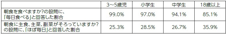特に、幼児期から学齢期のお子さんの朝ごはんは、主食(ごはんやパン等)は食べているけれども、主菜(肉や魚や卵のおかず)、副菜(野菜のおかず)がそろわないことが伺えます。
