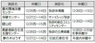 ※役場、サン・ビレッジ弥彦は12月28日(日)から1月4日(日)まで、弥彦体育館は12月28日(日)から1月3日(土)まで休止です。