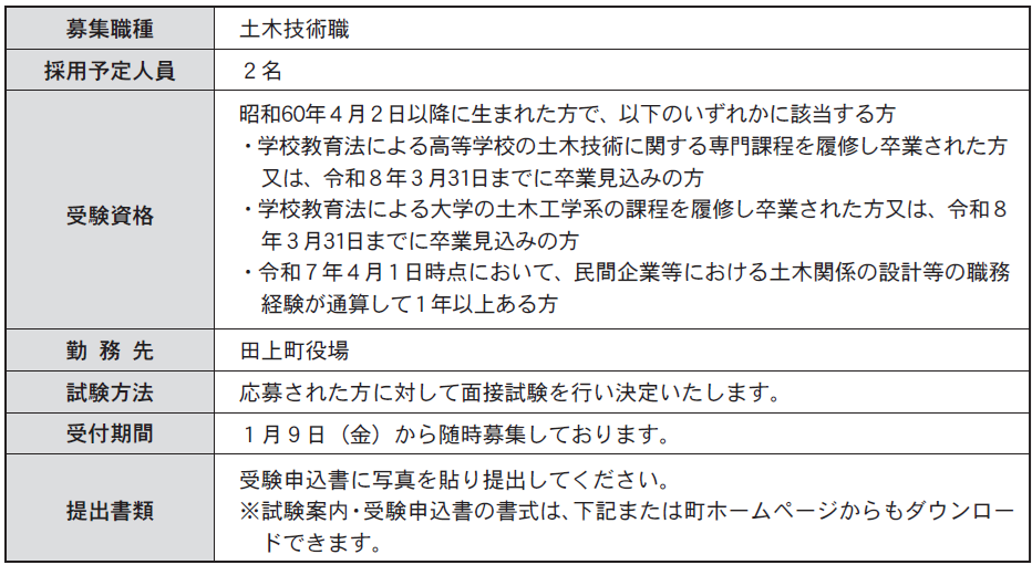 しごと 田上町職員募集(随時募集) 9/23 前の記事 次の記事 発行日 : 2026年01月09日 自治体名 : 新潟県田上町 広報紙名 : 広報たがみまち きずな 令和8年1月号 申込・問合せ:役場総務課庶務防災係 【電話】57-6222 Tweet シェアする お知らせ(2) 田上町水道委託検針員募集