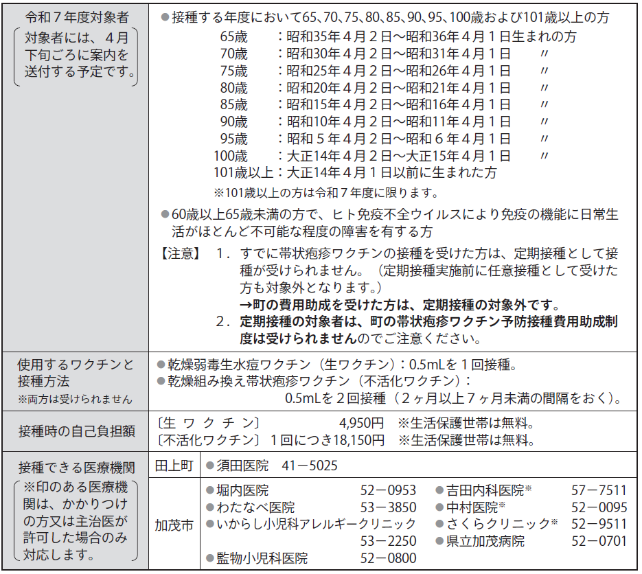 帯状疱疹ワクチン接種が定期接種となることに伴い、現在実施している帯状疱疹予防接種費用助成制度を、令和7年9月30日までに接種した分をもって終了します。(申請は令和8年3月31日まで受け付けます。)