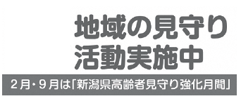 新潟県では、ひとり暮らし高齢者や認知症高齢者が増加する中、毎年9月及び2月を「新潟県高齢者見守り強化月間」と定めています。高齢者を県民総ぐるみで見守り、支え合う地域づくりに向け、町でも地域の高齢者を温かく見守りましょう。