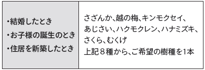 町では、緑を愛する町民のしあわせを祈り、また全家庭植樹の推進を図るため、下記に該当する方へ記念樹を贈呈しています。