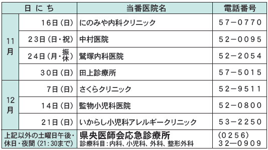 くらし 休日当番医のお知らせ 10/14 前の記事 次の記事 発行日 : 2025年11月14日 自治体名 : 新潟県田上町 広報紙名 : 広報たがみまち きずな 令和7年11月号 ★受付時間:午前9時~11時30分、午後1時~4時30分 ★急患のみご利用ください。 ★受診の際は、必ず電話で連絡をしてから来院ください。 Tweet シェアする 健康づくりのためのワンポイントコラム 今月の納税