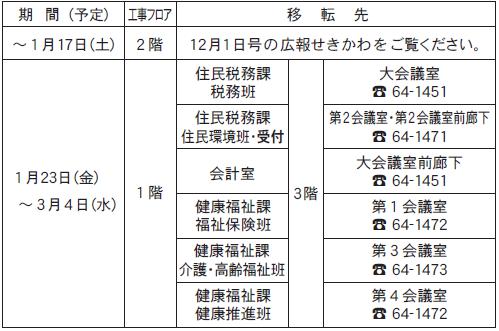 役場庁舎の省エネ改修工事を行っています。2階の工事が完了すると、次は1階の工事を実施します。工事期間中は、各課の執務場所が変更になります。受付は、3階第2会議室前廊下となりますので、ご注意ください。