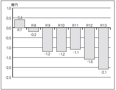 収支の赤字分を基金の取り崩しで賄いますので、収支が悪化するごとに基金の取崩額は増加します。令和9年度以降、基金残高が毎年1億円程度ずつ減少し、その減少額は年々増加していく見込みです。