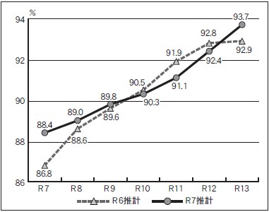 財政構造の弾力性を判断する指標で、人件費、光熱水費などのように経常的に支出される経費に充てた一般財源が、地方税、普通交付税を中心とする経常的に収入される一般財源に占める割合です。比率が高いほど財政構造の硬直化(自由度の低い状態)が進んでいることになります。物価の上昇や、村債返済額の増加により、全体的に高い値で推移する見込みです。