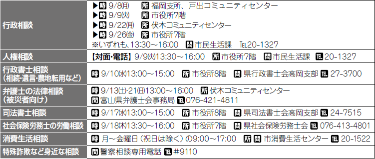 くらし 無料相談窓口 10/39 前の記事 次の記事 発行日 : 2025年09月01日 自治体名 : 富山県高岡市 広報紙名 : たかおか市民と市政 2025年9月号No.239 ■予約が必要な相談 ■予約が不要な相談 Tweet シェアする くらしの豆知識 図書館からのオススメ新刊情報