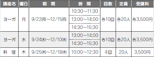 申込:9月3日(水)~10日(水)に、電子申請または直接か電話、はがきで住所・氏名(ふりがな)・生年月日・電話番号・希望講座名をふれあい福祉センター(〒933-0935 高岡市博労本町4-1)へ。