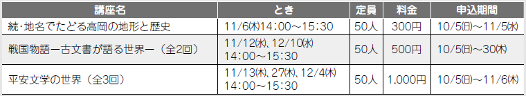 申込:直接か郵送、ファクス、Eメールで、住所・氏名・年齢・電話番号・希望講座名を文化振興事業団(〒933-0023 高岡市末広町1-7 ウイング・ウイング高岡内【FAX】20-1658【メール】[email protected])へ。