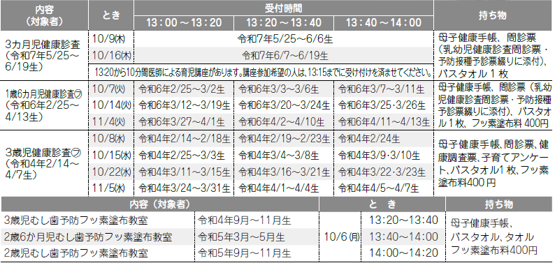 ・2歳児は歯の染め出しを行いますので、お子さん・保護者ともに汚れてもよい服装でお越しください。