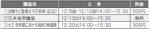 申込:11月5日(水)~(1)28日(金)(2)(3)12月12日(金)に、直接か郵送、ファクス、Eメールで、希望講座名・住所・氏名・年齢・電話番号を文化振興事業団(〒933-0023 高岡市末広町1-7ウイング・ウイング高岡3階【FAX】20-1658【メール】[email protected])へ。