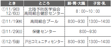 申込・問合せ:受診日の7日前まで、がん検診のお知らせに同封のはがきを返送(必着)か、電子申請または電話で(1)は北陸予防医学協会高岡総合健診センター【電話】24-3131、(2)(3)(4)は健康増進課【電話】20-1345へ。