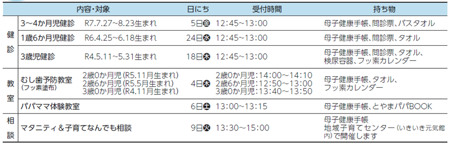 子育て 12月の健診・教室・相談 21/47 前の記事 次の記事 発行日 : 2025年12月01日 自治体名 : 富山県氷見市 広報紙名 : 広報ひみ 令和7年12月号 場所:いきいき元気館2階親子健康ルーム ※健診・教室・相談は前日までにひみっこアプリで要予約。 ※ダウンロード用二次元コードは本紙をご覧ください。 申込・問合せ:健康課 【電話】74-8062 Tweet シェアする 宅配便の再配達を減らしましょう! 12月の休日診療当番医(9:00~17:00)