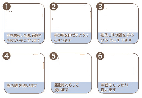 日常生活の中で、自分の手にもウイルスが付着している可能性があります。ウイルスの体内侵入を防ぐため、帰宅時や調理の前後、食事前などこまめに手を洗うこと、ウイルスは石けんに弱いため、石けんを使うことを心がけましょう。