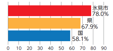 令和5年度の特定健診の結果、HbA1cが5.6%以上の人は、氷見市は78.0%と県や国と比較して、血糖値が高い人が多い状況です。